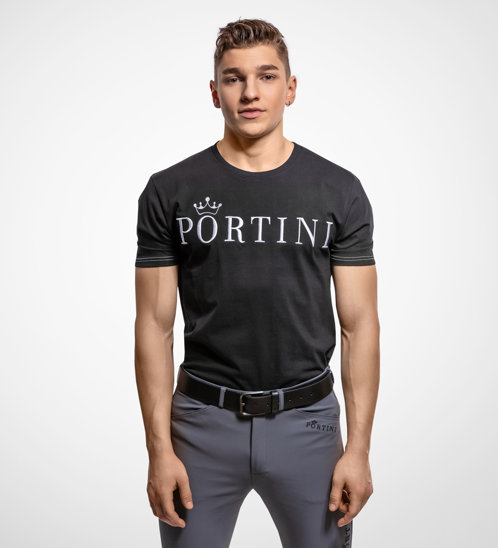 The Portini lettering on the left side below the pocket and on the leg. All logos are in embroidery . The Portini logo is in black. The breeche is in a high quality of 92% nylon and 8% spandex. It is very comfortable and soft to wear and looks very elegant and modern for sporty athletes.