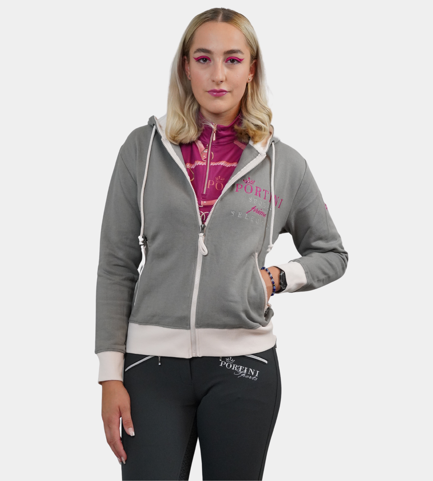 Hood, zipper and pockets are in pink. The Portini crowns on the left side of the sleeves and on the back are in Pink too. All logos are in embroidery .The Portini logo is in pink and pray on the left chest. The hoodie is in a high quality of 100% cotton. It is very comfortable to wear and looks very elegant and modern for sporty athletes.