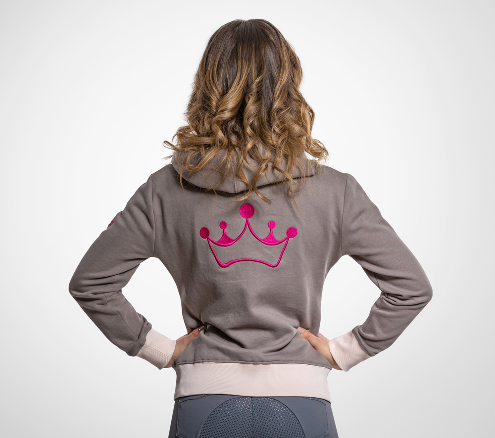 Portini Daisy is a hoodie in gray with hood, zipper and pockets in Pink. The hoodie is in a high quality of 100% cotton.