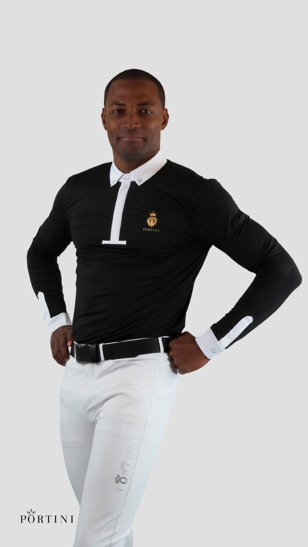 It has a fashionable golden Portini logo and a Portini crown on the back. It has a white zipper.