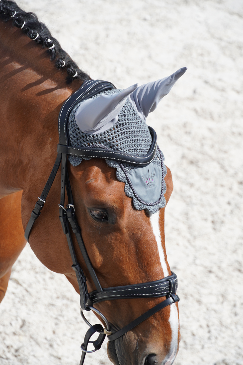 Die hellgraue Paspelierung passt zur Portini-Schabracke. Sie sieht im Turniersport sehr elegant aus und schützt Ihr Pferd vor Fliegen. Er ist mit einem weichen Vlies unterlegt, das als Auflagefläche für die Trense dient. Diese Fliegenhaube ist mit SWAROVSKI-Rauten oder ohne erhältlich – 100% Polyester